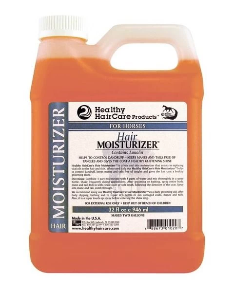A concentrate; mix one part of Healthy HairCare Hair Moisturizer with eight parts of water in a spray bottle. Spray on after daily grooming, after body clipping, bathing, or on blanket chafed areas. Spray onto tails, manes, coats, soft brush, towel, or massage into hair. Use on a wet or dry horse, clean or dirty. You are going to love the result! Healthy HairCare Hair Moisturizer for manes, tails and coats is a therapeutic lanolin enriched concentrate that assists in replacing vital oils to the hair and skin. Daily use helps to control dandruff and dry skin. Great for help with blanket rubs, mane and tail itching. You will cut grooming time in half while promoting healthy coats, manes and tails. 32 oz. – Makes 2 Gallons