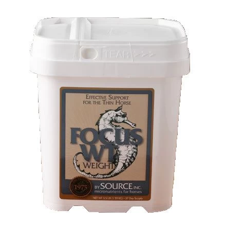 * NASC seal National Animal Supplement Council FOCUS by SOURCEGive your hard-to-keep horse a broad spectrum of micronutrients with specialized nutritional support for keeping or gaining weight. Certain horses seem to need more than good feed management and parasite control to gain weight or maintain it under stress. Extra calories may just not be enough. A good horse weight management program includes: quality hay and grain with protein and carbohydrate levels appropriate for the age and demands of the horse, a balanced calcium/phosphorus ratio, an effective parasite control program, fresh water at all times, free access to salt, and a good dental care program. If you’re doing all you can to keep weight on your horse and it still isn’t working, Focus WT may help. Focus WT is a unique formulation of broad-spectrum support nutrients including enzymes, beneficial microbes, B-complex vitamins and chelated trace minerals in an organic, highly bio-available form. Palatable alfalfa blend. 1-1/2 oz scoop included. For horses. Suggested Use: Mix 1-1/2 ounces (one scoop) per day per 1,000 lbs. body weight, with feed.